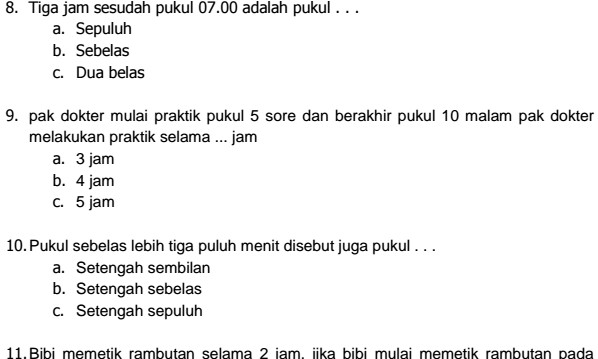 Soal mata pelajaran Matematika SD Kelas 2 Pengukuran waktu